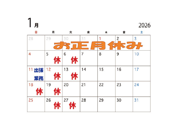 1月のお休みです。1月11日は出張業務のみの営業となります。ご予約お待ちしております!